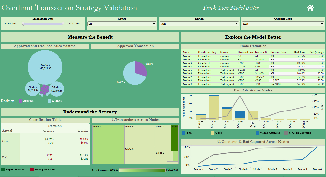 In today's world, all banks are using analytics to take more informed decisions. Banks use one or more decision tree algorithms to approve credit card transactions. The models are developed using business logic & intuition, either by in-house analytics teams or by third-party analytics vendors. Often banks struggle to monitor the performance of the business rules running within these models. Such monitoring is done either through ad hoc reports & tracking or periodic recalibrations of the models. It is imperative that banks examine the ongoing validity (versus obsolescence) of the models during such recalibration exercises. Banks that do not possess in-house analytics expertize could struggle to conduct such model evaluation & validation exercises, particularly in deciding whether the model-driven business rules continue to in sync with the banks' customer segments.